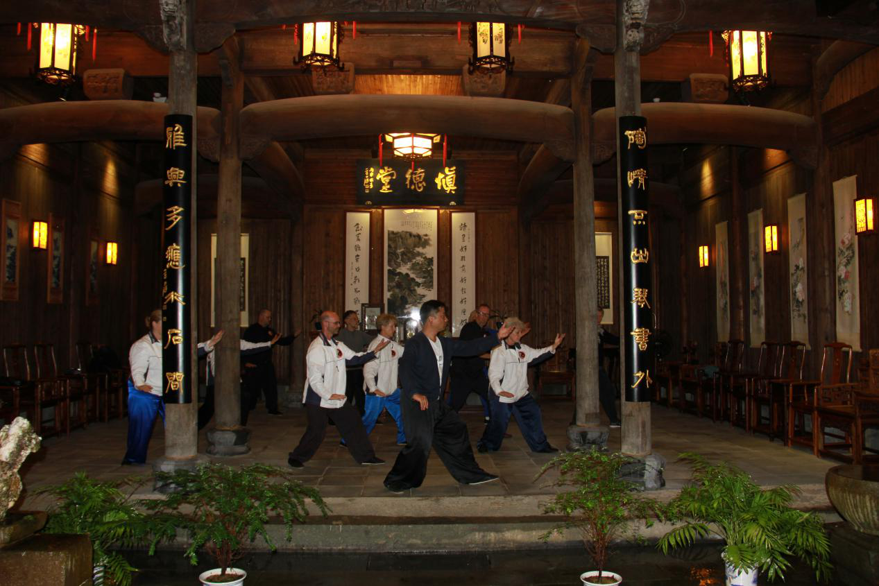 2017年10月16日晚,,,,来自瑞士的太极协会外宾来到了唐模景区,,,,组织了一次独具匠心的中西文化交流。。外宾们首先来到了唐模法国家庭旅馆,,,,在慎德堂举行了太极演练,,,,17日早上,,,,来到到继善堂浏览黄梅戏曲演出,,,,并与先生举行互动,,,,睁开学习,,,,整体合唱演出。。在游览完唐模景区后,,,,瑞士外宾们对唐模的水口文化十分的喜欢,,,,在唐模檀干园的镜亭中举行了一场太极演练。。