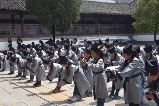 桃花潭景物区有着浓重的历史文化秘闻,,,,,诗仙李白曾游历此处并留下千古名诗。。。。。国学堂的选址亦有考究,,,,,中华第一祠乃是翟氏宗祠,,,,,每年清明时节都会举行祭祖大典,,,,,国学先生向导学生们相识宗祠文化,,,,,纪念先祖。。。。。此次“国学堂”首课由省中学语文教法研究会理事、资深国学先生,,,,,泾县二中高级语文西席张永胜主讲。。。。。张先生开场生动有趣地先容了桃花潭深挚的历史秘闻和淳厚好客民俗,,,,,随后习礼、读经。。。。。来自宁国文沁文学社的八十多位学生们身着汉服,,,,,敬重习礼,,,,,拜孔子,,,,,拜先生,,,,,手捧竹简学生规,,,,,正襟危坐,,,,,或诵读或讨论,,,,,受到了一次很是纯粹的古板经典的熏染。。。。。